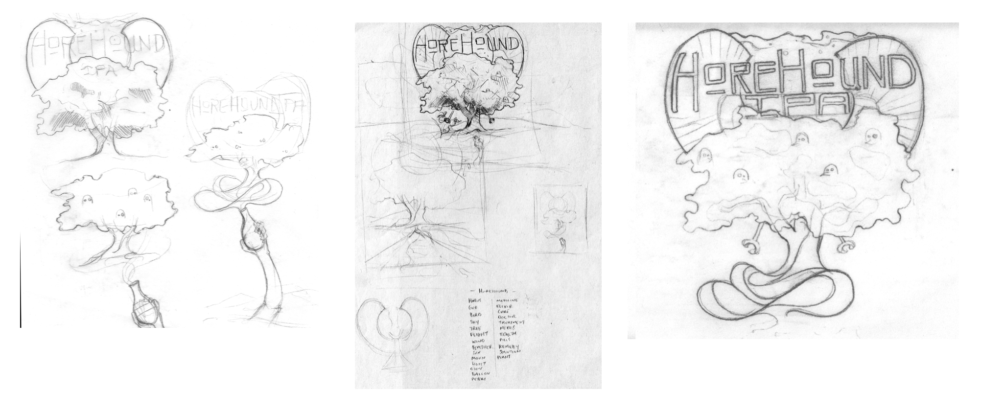 The process in building this image was what ended up becoming the approach to most all of my illustration work going forward. Research was the point of inspiration, starting with what the fuck (pardon) is a Horehound? To avoid this becoming a research paper, horehound is a plant in the mint family, it has been used for various medicinal purposes by many cultures over history. Initially I played with the idea of vintage medicinal labels, something that felt too limiting and ultimately misleading. Further research lead me to find that the plant was thought to be named after Horus, the Egyptian god. As someone who’s always been fascinated with this part of history I was happy to use this as a springboard for visual ideation. Although it was a lot of fun to try and incorporate the graphic nature of Egyptian symbols into a more illustration-heavy scene it just wasn’t working from a label standpoint.