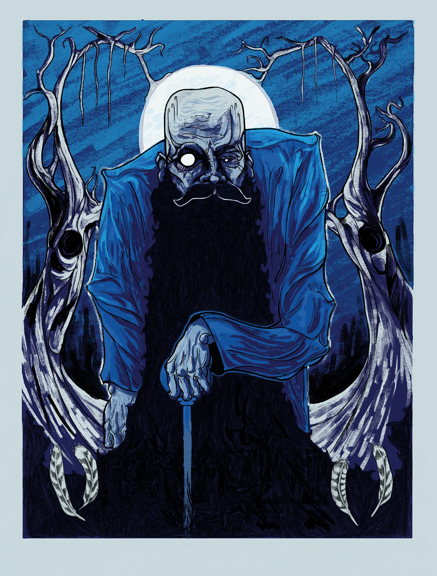 In a much more subconscious state I landed on a cropping of a bald head, a mysterious man I’d imagined to represent Horus still alive today and after dozens of drawings I found extremely subtle ways to incorporate symbols that were in direct connection to the symbol of the god. His eyes and the varying scale were representations of the sun and moon and a higher power watching, the the bird’s figure and wings are engraved into the wrinkles between his eyes and on his forehead, a detail that became less apparent by the time the final drawing came about. Finally, the trees surrounding him form the wings of the symbol of Horus.