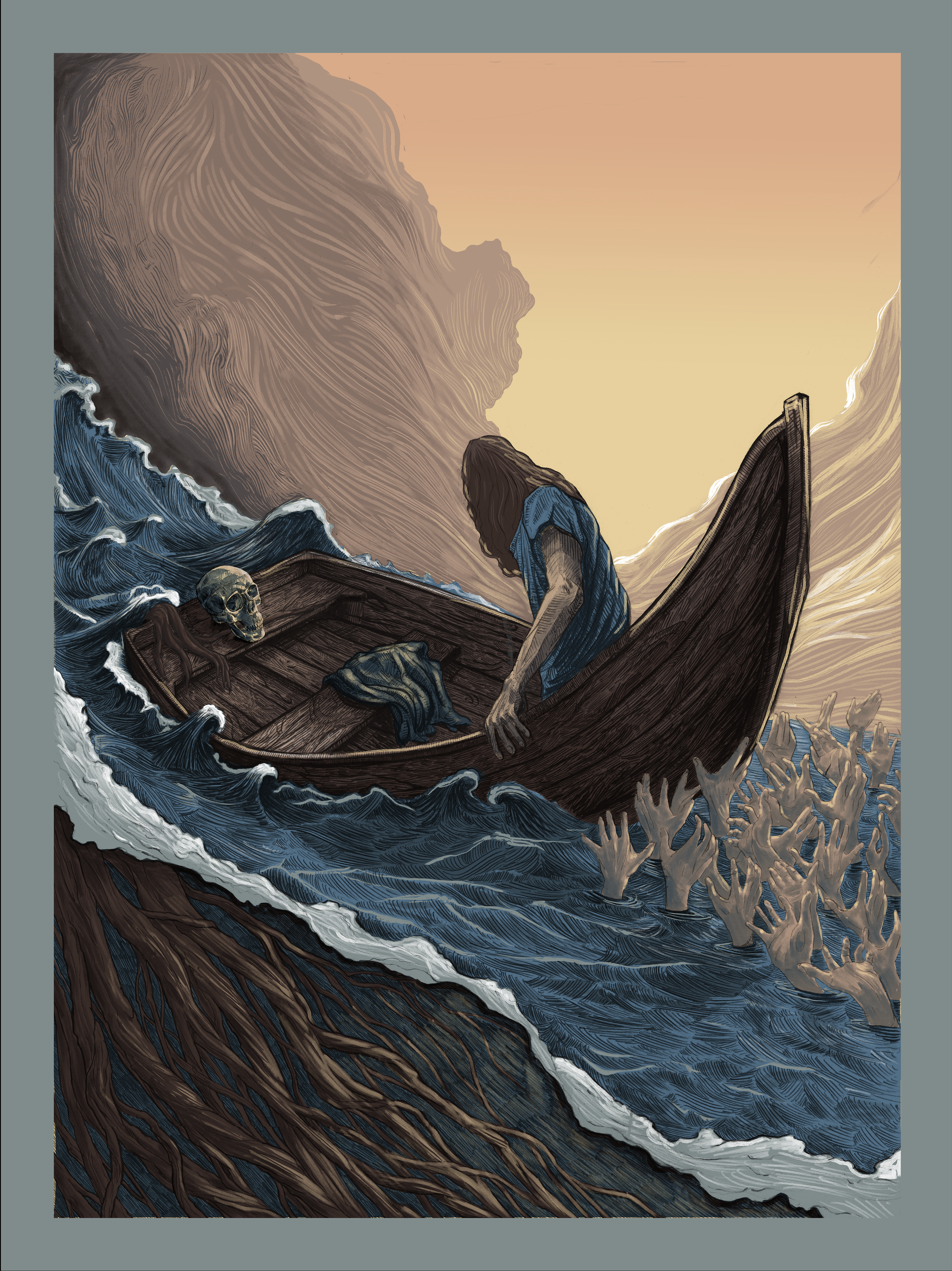 In this image the man on the boat is in turbulent waters, clearly struggling to remain afloat. The skull starring at the figure represents the passing of the lead singer’s father, unknown to him until a few yers later. The story of this song is a struggle for the meaning of family, and the roots looming below are a nod to a family tree not visible. The lead singer described his experience of this song beginning as something dark and depressing. Eventually, the energy of crowds singing along shifted a new, positive light to the songs meaning. The hands show a sort of mosh crowd begging to hold up the boat, this to me was a perfect marriage of the commission representing the song’s history and its connection to the very fans that this was commissioned for. Lastly, there is a bright clearing in the sky which is intended to visually and metaphorically connect to the hands.